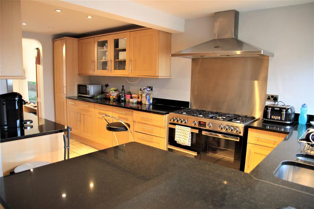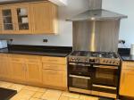 17' 4'' x 13' 4'' (5.3m x 4.08m) Double glazed leaded window to front. Range of matching wall and base units with Granite work tops with upstands over, and breakfast bar. Freestanding 7 burner gas Belling range style stainless steel cooker and extractor hood, single sink unit with mixer tap/spray tap, tiled floor. Plumbing for dishwasher. Plumbing for American Style Fridge/Freezer. Recessed lighting. Archway through to lounge/dining.