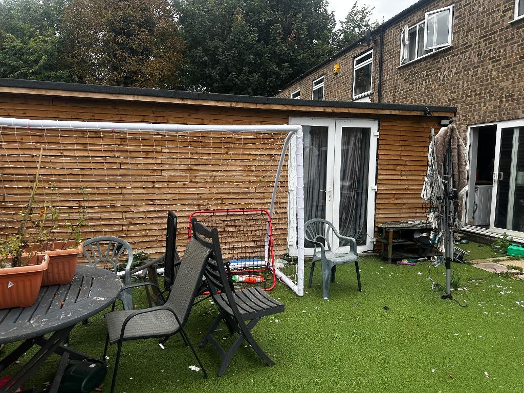 Mainly laid to artificial low maintenance lawn area. Childs wooden playhouse and also a large 7ft x 4ft Summer house with light and power. Outside tap and lights