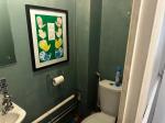White suite comprising low level w.c. and pedestal wash hand basin. Laminate floor. Radiator.