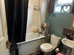 White suite comprising bath with shower attachment over. Low level w.c. pedestal wash hand basin. Part tiled walls. Radiator.