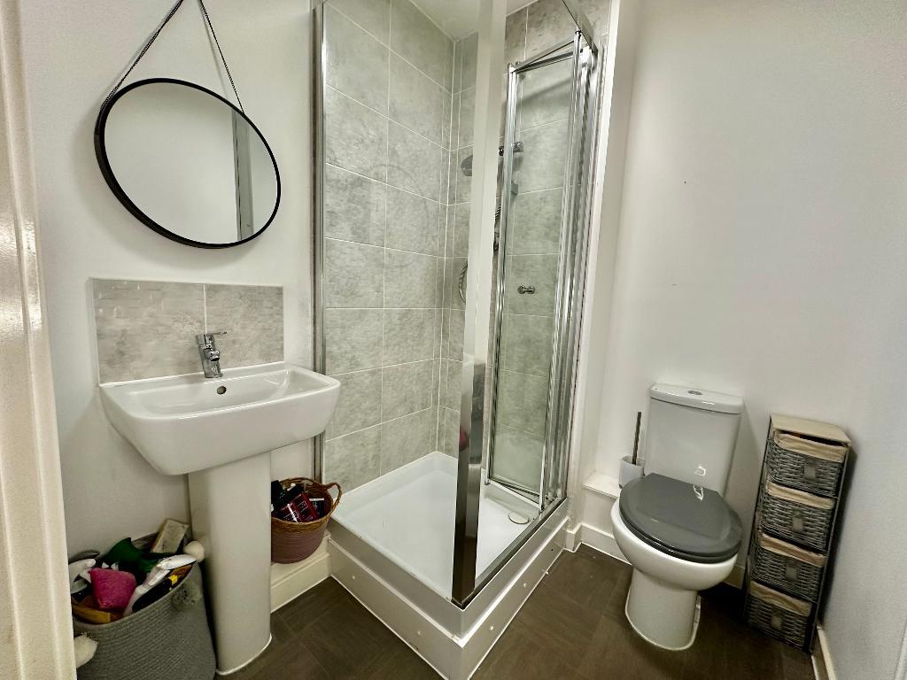 5' 4'' x 4' 3'' (1.65m x 1.3m) Walk in tiled shower unit. low level w.c. Wash hand basin, radiator and tiled walls