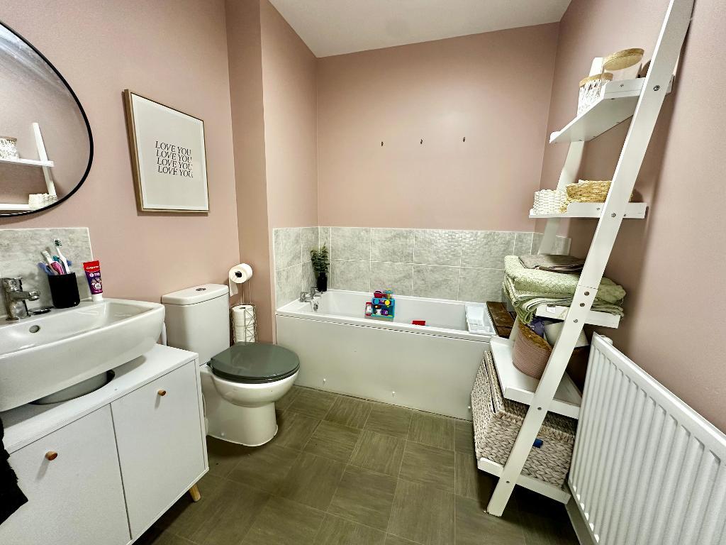 6' 3'' x 7' 3'' (1.92m x 2.23m) White bathroom suite comprising bath, low level w.c. pedestal basin. Part tiled walls. Tiled floor