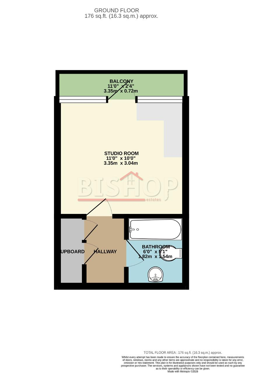 10' 5'' x 11' 8'' (3.2m x 3.58m) Bright ground floor studio space with kitchenette comprising matching wall and base units, 2 plate ceramic hob, microwave, fridge with freezer compartment, stainless steel sink and drainer. Double glazed windows overlooking garden and double glazed door to private balcony. Newly redecorated throughout with new carpets and LVT flooring. Electric radiator