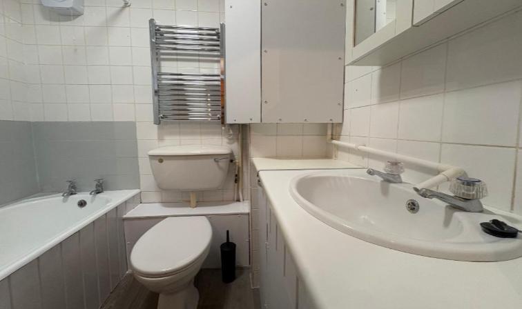 5' 10'' x 6' 5'' (1.79m x 1.96m) Fully tiled bathroom with white bath and electric shower over, shower curtain, low white WC and built in boiler in cupboard. Storage space below sink and bathroom cabinet over. New LVT flooring. Centre ceiling light. Heated towel rail