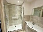 White suite comprising of bath, with low level w.c. white basin with vanity unit under, separate double tray shower cubicle. Part tiled walls. Laminate flooring.