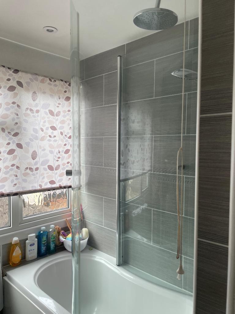 Double shower cubicle, white low level wc, wash hand basin. Fully tiled walls. Tiled floors. Heated towel rail. Two full height storage cabinets. Double glazed opaque window to side.