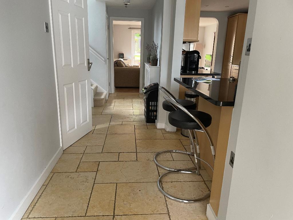 18' 9'' x 5' 7'' (5.73m x 1.72m) Tiled floors. Recessed spotlights. Window to side. Door to utility room. Door to garage. Door to storage cupboard. Radiator. Two steps up to main hallway and kitchen. Radiator cover at the end of the hallway towards lounge.