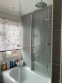 P-shaped white panelled bath with shower mixer over, fully tiled walls by bath, shower screen, sink unit with vanity under, double glazed opaque window to front. Radiator. Recessed lighting. Tiled floors.