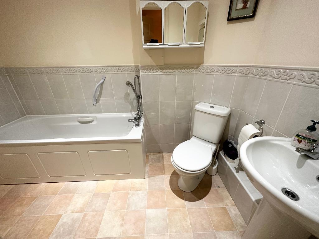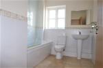 8' 9'' x 5' 8'' (2.69m x 1.73m) Bathroom suite comprisng of panelled bath with mixer tap and shower attachment, part tiled walls, low level wc, pedestal wash hand basin, mirror, heated towerl rail.