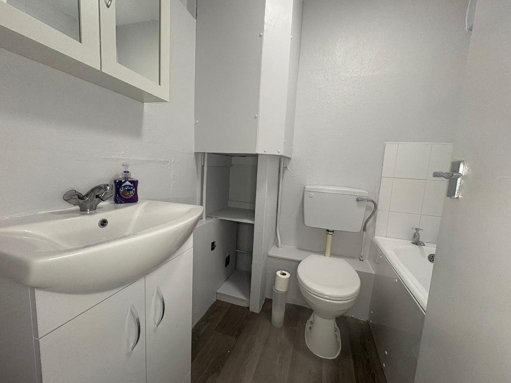 10' 3'' x 2' 6'' (3.14m x 0.79m) Fully tiled bathroom with electric shower over the bath, wash hand basin, low level wc, wall mounted mirrored cupboard and under sink vanity. New LVT flooring.