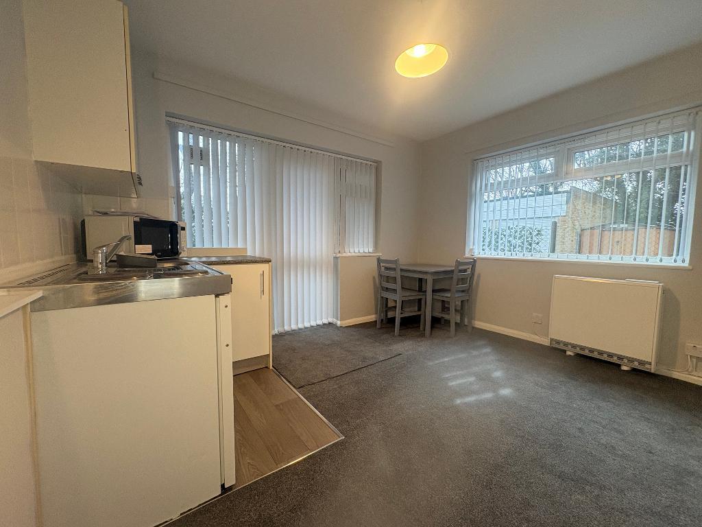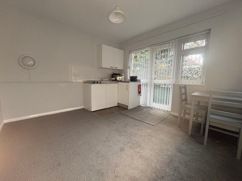 Newly refurbished studio room. Newly fitted carpet, double glazed windows to rear and side with French door to private balcony overlooking rear car park.