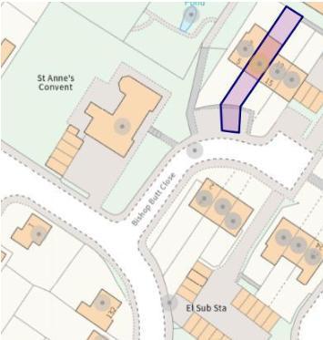 Decked area, mainly laid to lawn, garden shed, rear access gate.