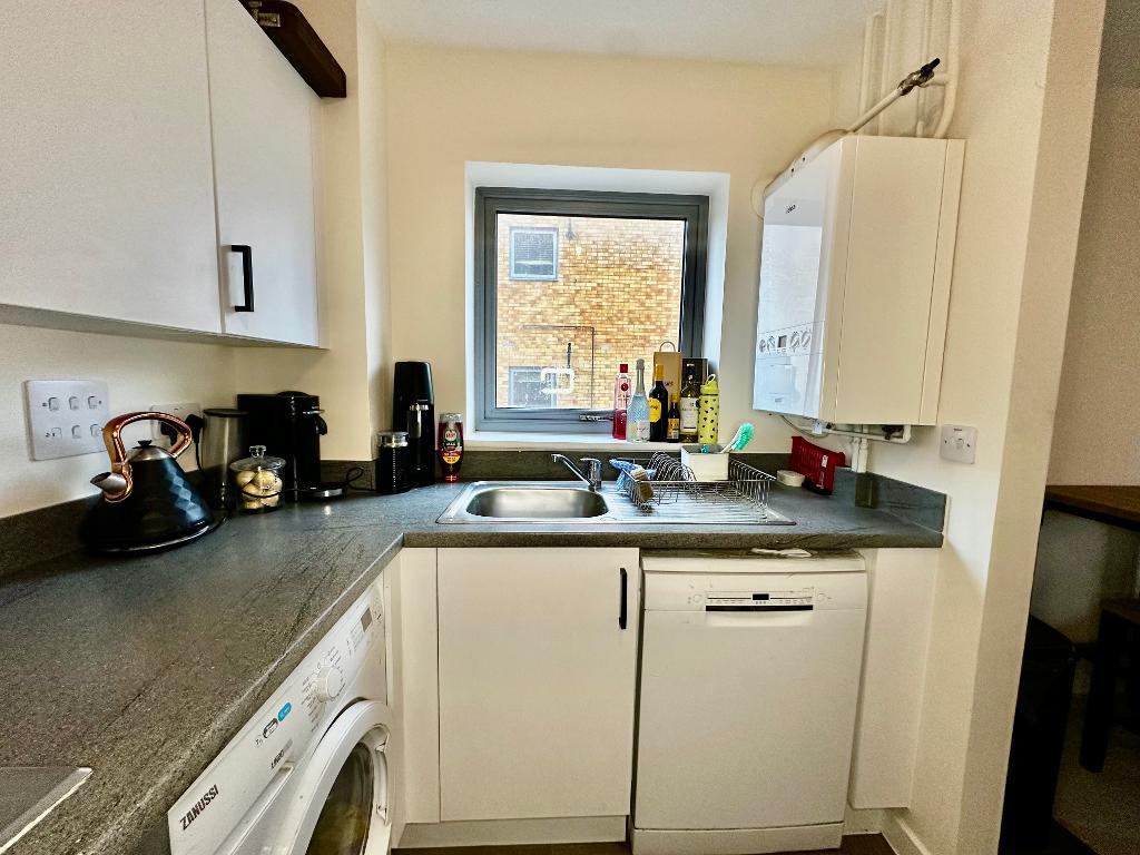 Open kitchen area with a range of white wall and floor units with ample worktops over. Electrolux under oven, with 4 ring has hob above and extractor fan. Stainless steel sink with mixer taps underneath window. Free standing fridge freezer, washing machine with tumble dryer. Space and plumbing for dishwasher. Ideal gas boiler.