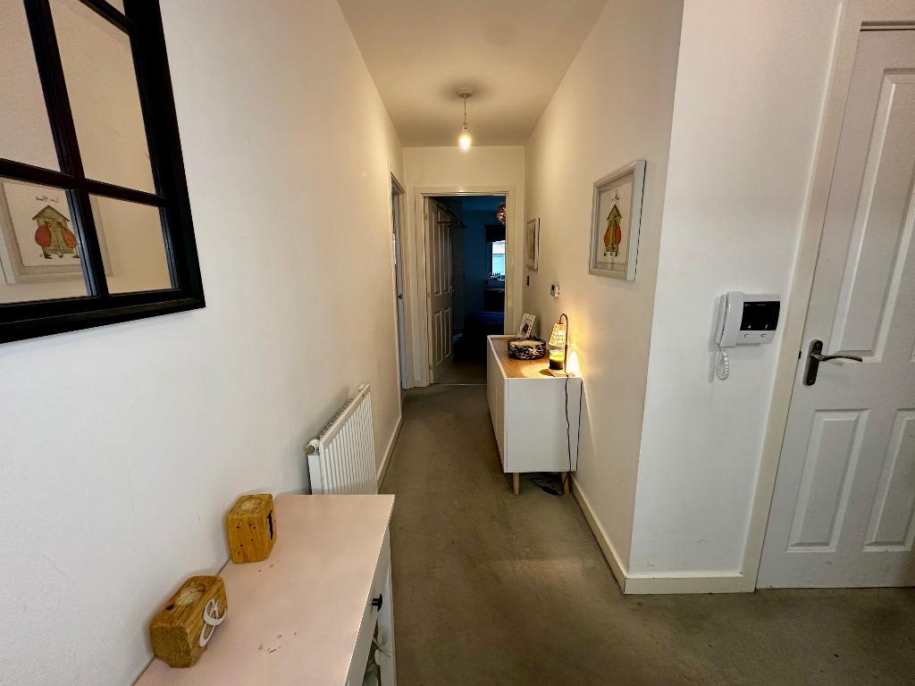 Entry to a bright and spacious hallway, with storage cupboard and radiator.