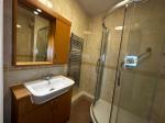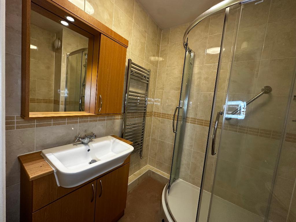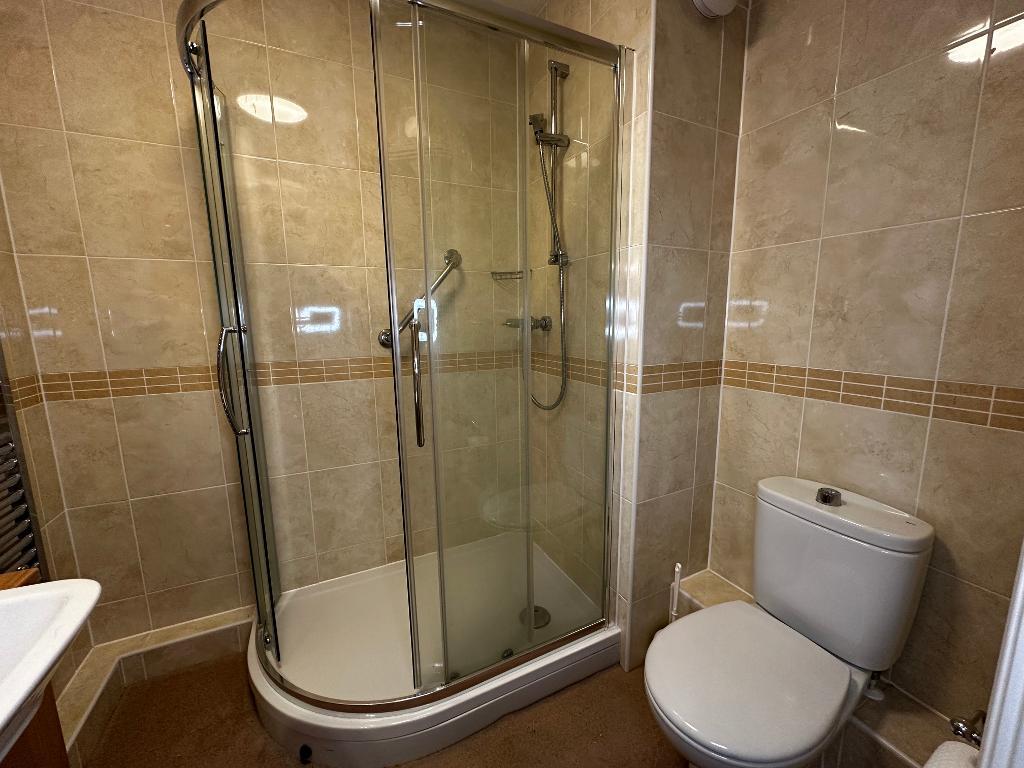Attractively fitted with a white suite comprising:- corner shower cubicle, low level WC, and vanity wash hand basin unit with storage beneath. Fully tiled walls with decorative border. Heated towel. Extractor fan.