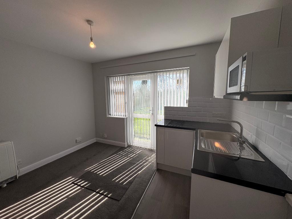 10' 5'' x 11' 8'' (3.2m x 3.58m) Bright ground floor studio space with kitchenette comprising matching wall and base units, 2 plate ceramic hob, microwave, fridge with freezer compartment, stainless steel sink and drainer. Double glazed windows overlooking garden and double glazed door to private balcony. Newly redecorated throughout with new carpets and LVT flooring. Electric radiator