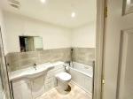 White suite comprising of bath, with low level w.c. white basin with vanity unit under, separate double tray shower cubicle. Part tiled walls. Laminate flooring.